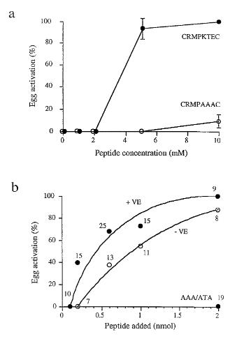 Fertilin, a sperm protein of the metalloprotease/disintegrin/cysteine-rich (MDC) family, plays a critical role in sperm-egg binding in mammals. Peptides corresponding to the disintegrin domain of fertilin and antibodies against fertilin have been shown to inhibit mammalian sperm-egg binding and fusion. A protein from the same family, xMDC16, was recently cloned from frog (Xenopus laevis) testis and was found to be involved in frog sperm-egg binding. Here we report that xMDC16 is localized predominantly on the posterior surface of egg jelly-activated sperm, and peptides from the disintegrin domain of this protein activate eggs when applied near the egg surface. Egg activation was dependent on (1) specific amino acid residues (KTX); (2) the presence of divalent cations, but not external Ca2+ alone; and (3) voltage across the egg plasma membrane. This is the first demonstration of egg activation in vertebrates by the surface application of a peptide derived from a sperm surface protein, supporting a model for egg activation that involves a signal transducing receptor for sperm in the egg's plasma membrane.