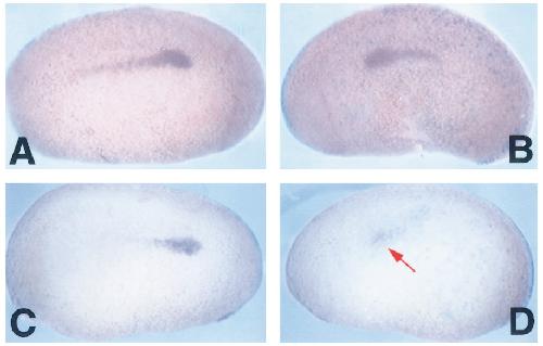 side (D). The result indicates that ectopic xWT1 mRNA expression inhibits pronephric development at a very early stage.