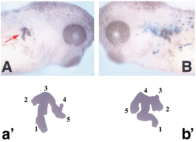 the pronephric region of the injected side (B). (a9 and b9). Enlarged, diagrammatic representation of the pronephroi in A and B. For