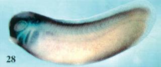 cdh11 (cadherin-11) gene expression in Xenopus laevis embryo, assayed via in situ hybridization, NF stage 28, lateral view, anteriorleft, dorsal up.