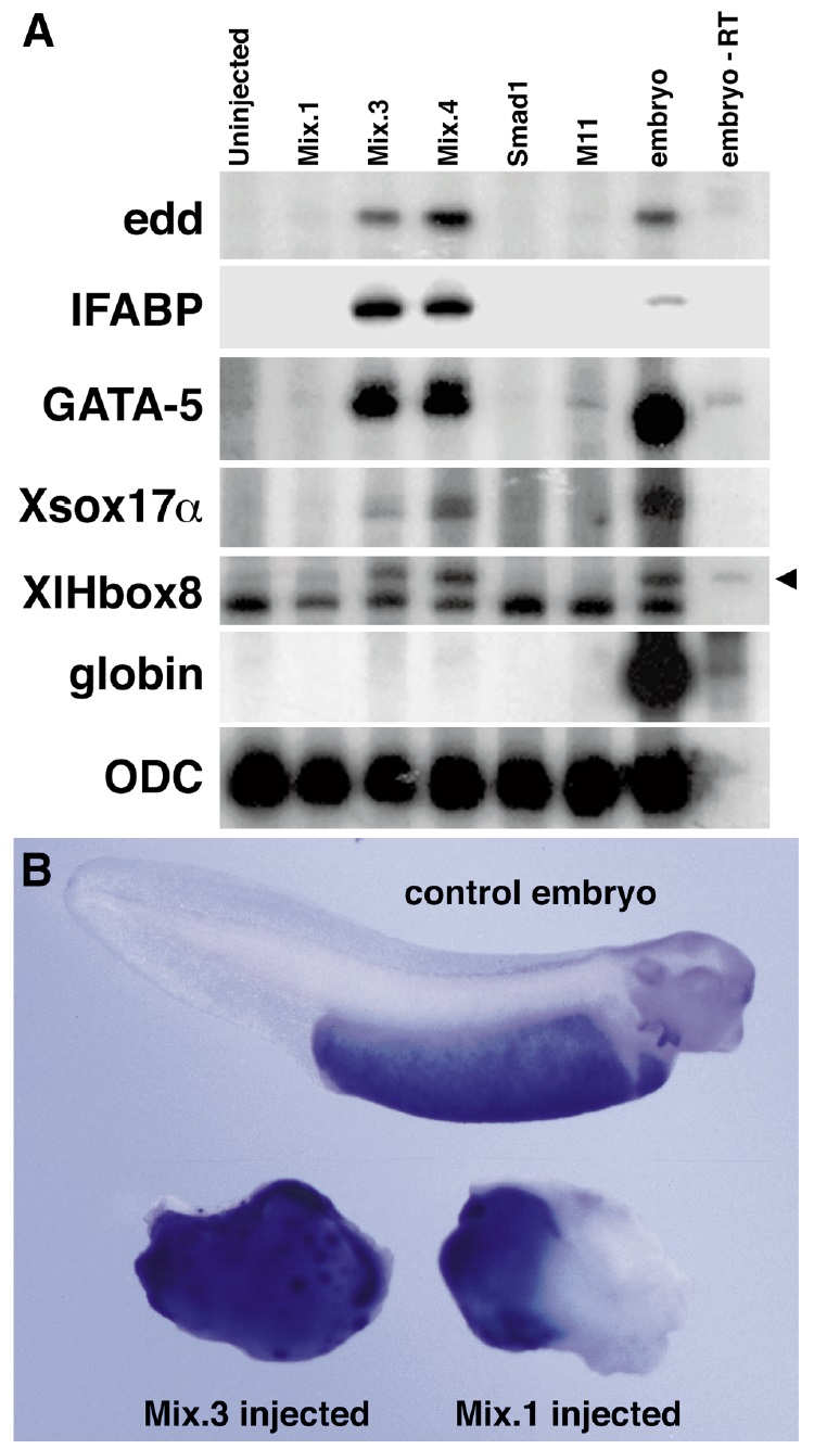 Mix.1, a homeobox mRNA inducible by mesoderm inducers, is expressed mostly in the presumptive endodermal cells of Xenopus embryos.