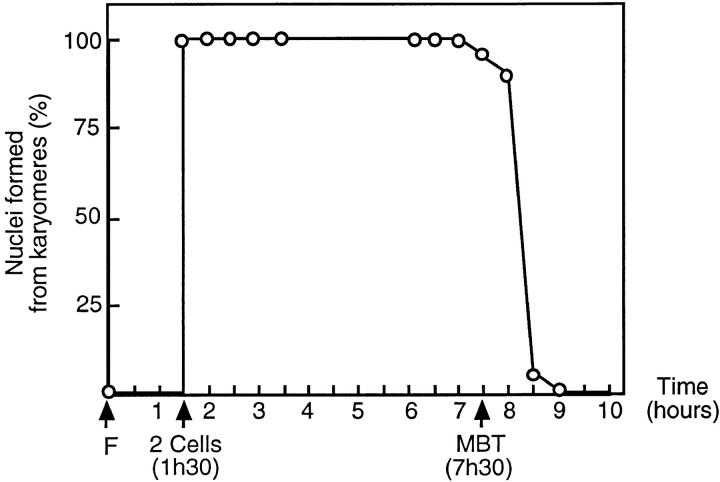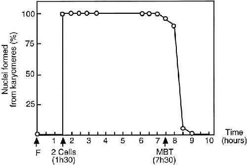 Figure 2. Karyomere formation is specific from the early embryogenesis. Xenopus embryos incubated at 21°C were taken from synchronized fertilized eggs at different times after fertilization. The kinetics and synchrony of cleavage were examined by light microscope during the first cell cycles; cycles were 30 min. The reorganization of the chromatin was analyzed by DNA staining with Hoescht 33258 dye as described in Materials and Methods. The plot shows the percentage of nuclei formed from karyomeres as a function of time after fertilization.