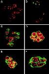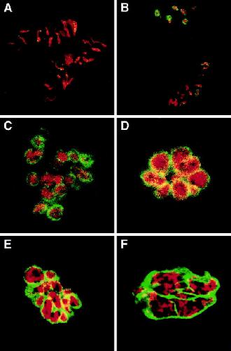 Figure 3. Lamins bind and surround each chromosome during the early embryonic cell cycles. Early embryos were prepared as described in Materials and Methods and submitted to indirect immunofluorescence visualization with a 687A7 monoclonal anti-lamin antibody (13). DNA was stained with propidium iodide. Green, lamins; red, DNA. A–F are successive stages of the organization of the nucleus during each cell cycle from anaphase (A) to prophase (F).