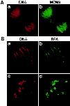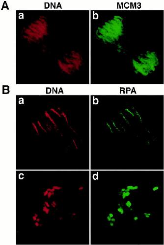 Figure 4. Prereplication centers are defined during anaphase. Early embryos were submitted to indirect immunofluorescence with XMCM3 (A) or RPA (B) antibodies. Red, DNA staining (propidium iodide); green, XMCM3 and RPA. Anaphase chromosomes at both poles (A, a and b) or one pole (B, a and b) and telophase karyomeres (B, c and d) are presented.