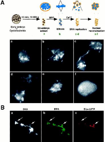 Figure 6. (A) An embryonic extract which mimics the early embryonic cell cycles. An extract was prepared from early embryos containing G2 synchronized nuclei, as described in Materials and Methods. The extracts were incubated for 30 min at 23°C after addition of a metaphase-arrested egg extract. Under these conditions, the nuclear membrane breaks down and nuclei arrest at the metaphase stage of mitosis. Completion of mitosis and S phase was induced by addition of 0.6 mM CaCl2. Samples were then placed onto slides and fixed as described as in Materials and Methods. (a) G2/prophase embryo nucleus; (b) metaphase; (c) anaphase, 15 min after Ca++ activation; (d) early telophase, 15–30 min after Ca++ activation; (e) mid-telophase 30 min after Ca++ activation; (f) prophase 45–60 min after Ca++ activation. DNA was stained by Hoechst 33258 and observed by video enhanced microscopy. (B) DNA replication occurs in karyomeres in vitro. An extract from embryos synchronized in G2 was induced to undergo mitosis by addition of MPF activity as described in Materials and Methods. Biotin-dUTP (20 μM) was then added and completion of mitosis and S phase was induced by further addition of 0.6 μM CaCl2. Samples were analyzed for biotin-dUTP incorporation 15–30 min after activation by Ca2+. Biotin in DNA was detected by indirect immunofluorescence with streptavidin Texas red (c) and RPA (b) immunostaining was detected with specific antibody. DNA was stained with Hoescht 33258 dye (a). Long and short arrows show condensed and decondensed chromatin respectively into independent karyomeres, respectively.