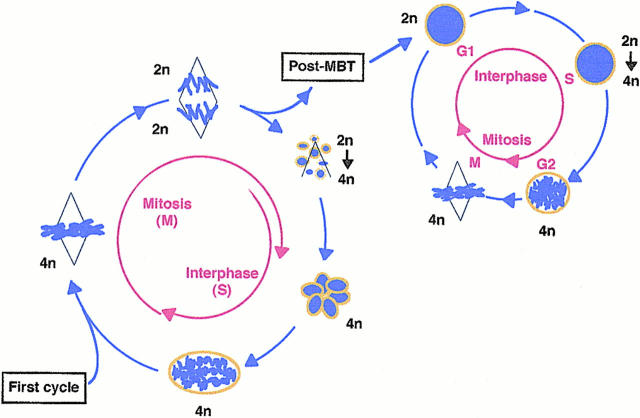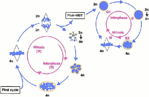 Figure 8. The cell cycle during early development and after MBT. At each cell cycle during the first twelve divisions, chromosomes, during their segregation to the poles, form karyomeres wherein DNA replication begins. A distinct transition occurs at the mid-blastula stage when karyomeres are no longer formed during segregation. The nucleus is then reconstructed from 2n chromosomes, and a classical cell cycle appears for the first time during development.