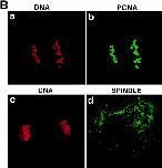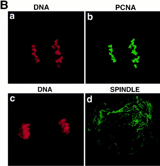 Figure 5. S phase occurs in karyomeres before nuclear formation and cell division in vivo. (A) Early embryos were incubated with BrdU for a 10-min pulse and prepared as described in Materials and Methods. BrdU incorporation was detected by indirect immunofluorescence after using an anti-BrdU antibody and DNA was visualized with Hoechst staining. BrdU incorporation is in red (b and d), and DNA in gray (a and c). Nuclei at anaphase (a and b) and early telophase (c and d) are shown. (B) Early embryos were examined by indirect immunofluorescence with PCNA and β tubulins antibodies. Green, PCNA (b) and β tubulins (d); red, DNA staining (propidium iodide) (a and c).