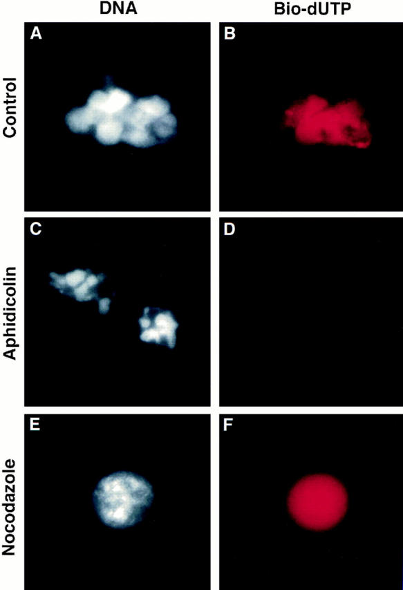 Figure 7. Karyomere formation occurs independently of DNA replication but requires spindle formation. An embryonic extract containing endogenous G2 nuclei was released into mitotic metaphase as in Materials and Methods (A and B). DNA replication was blocked by 50 μg/ml aphidicolin (C and D), and spindle formation was prevented by 5 μg/ml nocodazole (E and F). Biotin-dUTP (20 μM) was added and progression into S phase was induced by 0.6 mM CaCl2. DNA synthesis was followed by biotin-dUTP incorporation after 15–30 min of incubation in B, D, and F. DNA was stained by Hoescht 33258 (A, C, and E).