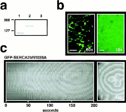 In Xenopus laevis oocytes, overexpression of calreticulin suppresses inositol 1,4,5-trisphosphate-induced Ca2+ oscillations in a manner consistent with inhibition of Ca2+ uptake into the endoplasmic reticulum. Here we report that the alternatively spliced isoforms of the sarcoendoplasmic reticulum Ca2+-ATPase (SERCA)2 gene display differential Ca2+ wave properties and sensitivity to modulation by calreticulin. We demonstrate by glucosidase inhibition and site-directed mutagenesis that a putative glycosylated residue (N1036) in SERCA2b is critical in determining both the selective targeting of calreticulin to SERCA2b and isoform functional differences. Calreticulin belongs to a novel class of lectin ER chaperones that modulate immature protein folding. In addition to this role, we suggest that these chaperones dynamically modulate the conformation of mature glycoproteins, thereby affecting their function.
