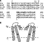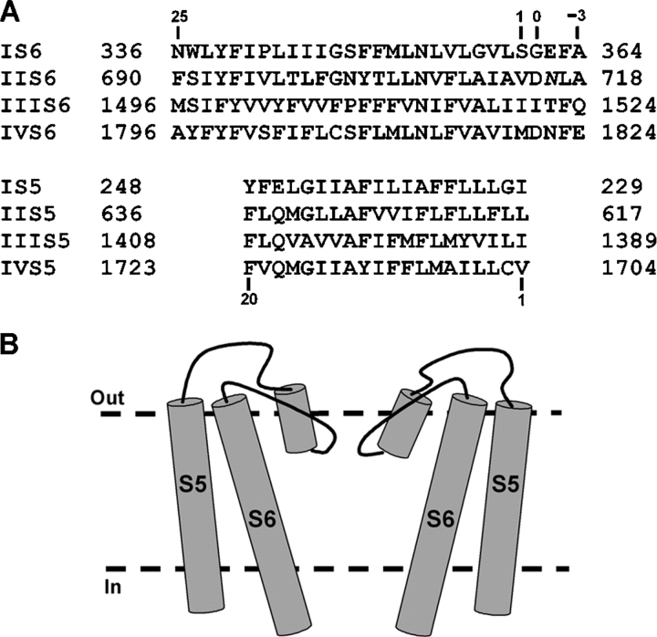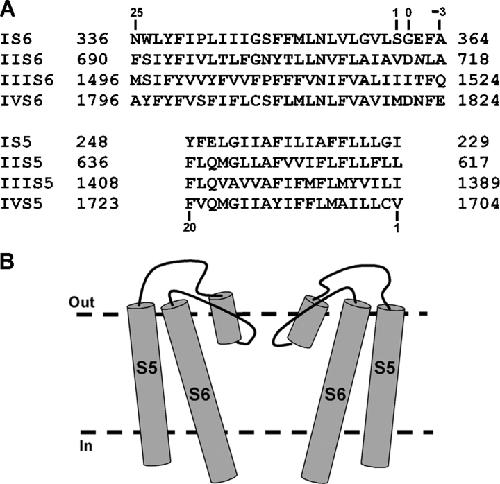 Figure 2. Amino acid sequences and schematic topology. (A) Amino acid sequence of S6 and S5 segments in the four repeats of the Cav2.1 subunit. Amino acid numbers are given on both sides. The numeration of residues in each repeat defined in this study is shown on the top and bottom. Position 0 presumably represents the membrane/cytoplasm interface. (B). Schematic topology of the S5 and S6 segments and the P-loop of two repeats.