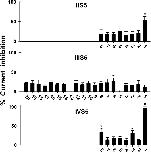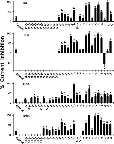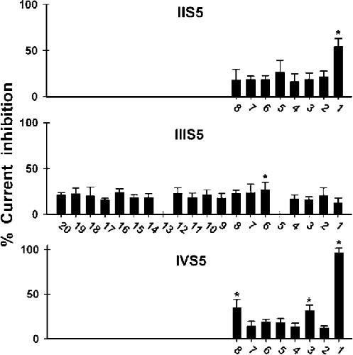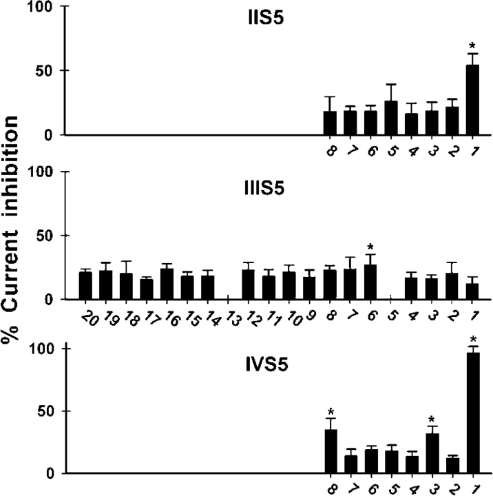 Figure 7. Summary of the effect of MTSET on S5 mutant channels. Bars represent current inhibition by 4 mM internal MTSET on S5 cysteine mutant channels (n = 3–8). Stars indicate the mutant channels that were significantly inhibited compared with the control channel (P < 0.05). Mutants bearing the cysteine mutation in positions 5 and 13 in IIIS5 failed to produce functional channels.