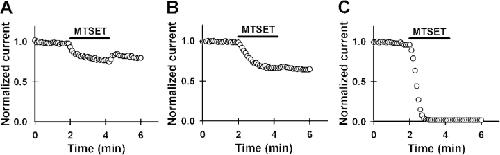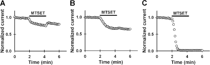 Figure 4. Examples of different effects of MTSET on cysteine mutant channels. (A) Time course of little inhibition of IS6-V3C by internal MTSET. 4 mM MTSET was applied continuously for 2 min. Current was evoked from a holding potential of −80 mV every 6 s by a 500-ms depolarization to a voltage that gives >70% channel open probability. (B and C) Time course of partial inhibition of IIIS6-P13C (B) and complete inhibition of IIS6-V1C (C) by internal MTSET. Experiment conditions were the same as in A.