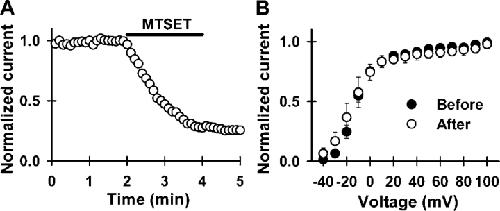 Figure 6. Gating is not changed after modification by MTSET. (A) Time course of inhibition of a representative mutant channel, IS6-L2C, by 4 mM internal MTSET. (B) Voltage dependence of activation of IS6-L2C before (filled circle) and after (open circle) MTSET application (n = 6).