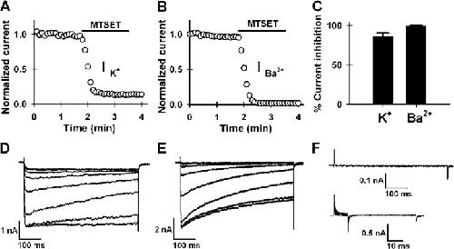 Figure 9. Inhibition of divalent and monovalent current by MTSET. (A and B) Time course of inhibition of monovalent (K+) current (A) and divalent (Ba2+) current (B) of IIS6-A4C by internal MTSET. (C) Bar graph summarizing the degree of inhibition of monovalent and divalent current. (D and E) Exemplar monovalent (D) and divalent current traces (E) during MTSET inhibition. Monovalent current was evoked from a holding potential of −100 mV every 6 s by a 500-ms depolarization to −30 mV. Divalent current was evoked by the same voltage protocol as in Fig. 1 B. (F) Absence of endogenous monovalent current from uninjected oocytes at −30 mV (top traces) and all voltages from −80 to +60 mV (bottom traces, currents were evoked from a holding potential of −100 mV every 3 s by 10-ms depolarizations from −80 to +60 mV in 10-mV increments, followed by a 50-ms repolarization to −80 mV).