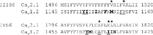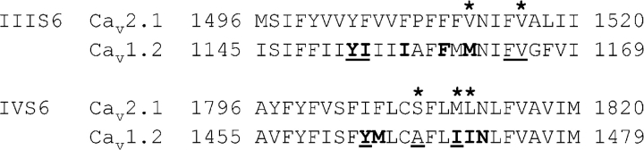 Figure 10. Amino acid sequence alignment of IIIS6 and IVS6 of Cav2.1 with those of Cav1.2. The bold and underlined residues in IIIS6 and IVS6 of Cav1.2 represent residues whose mutations affect the binding of DHPs and PAAs, respectively. Stars indicate MTSET-reactive residues in Cav2.1.