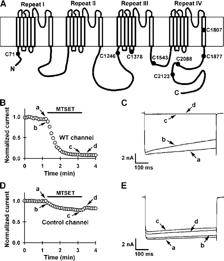 Figure 1. Construction of a control channel nonreactive to internal MTSET. (A) Putative transmembrane topology of the α1 subunit of a voltage-gated Ca2+ channel. Black dots show the location of the endogenous cysteines that were substituted with alanines. (B and D) Time course of inhibition of the wild-type channel (B) and control channel (D) by 4 mM internal MTSET. Current was evoked from a holding potential of −80 mV every 6 s by a 500-ms depolarization to +30 mV. (C and E) Exemplar current traces of the wild-type channel (C) and control channel (E) taken immediately before (a) and after (b) MTSET application and immediately before (c) and after (d) washout of MTSET, as indicated in B and D.