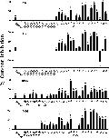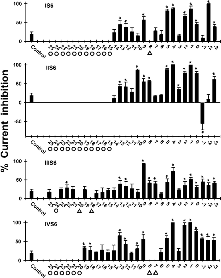 Figure 3. Summary of the effect of MTSET on S6 mutant channels. Bars represent current inhibition by 4 mM internal MTSET on the control channel (n = 20) and S6 cysteine mutant channels (n = 3–15). Stars indicate mutant channels that were significantly inhibited compared with the control channel (P < 0.05). Circles and triangles indicate, respectively, positions that were either not mutated or mutated but failed to produce functional channels. Original data are summarized in Tables I−IV. Experiment conditions were the same as in Fig. 4 A.