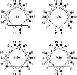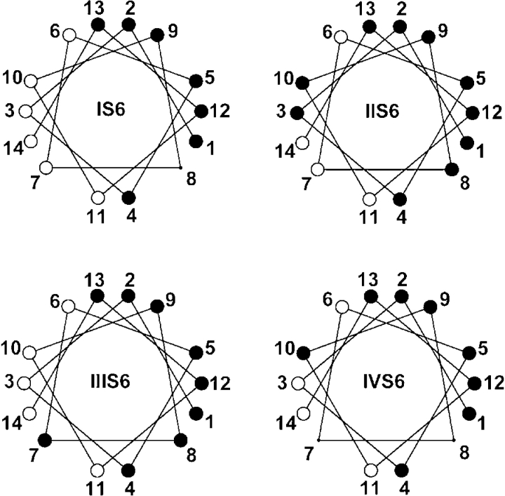 Figure 5. Helical wheel representation of MTSET modification of S6 positions. The effect of internal MTSET on the cysteine mutant channels (position 1–14) for each S6 segment is shown in an α-helix wheel. Filled circles indicate positions that were modified by MTSET and open circles indicate those that were not modified. Cysteine mutant channels that had no function are shown in little black dots.