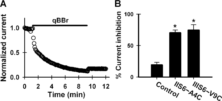 Figure 8. Effect of qBBr on the control channel and two S6 mutant channels. (A) Time course of inhibition of IIIS6-V9C by 4 mM internal qBBr. (B) Bars represent current inhibition of the control and mutant channels by 4 mM qBBr applied to the intracellular side for 8 min. Steady-state inhibition was not reached due to the slow modification.