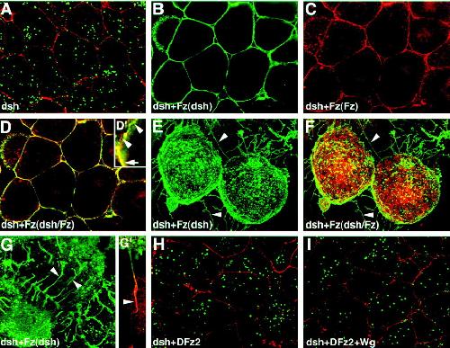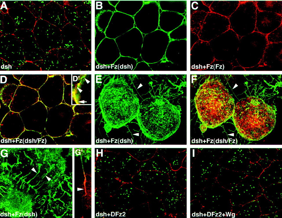 presence (shown) or absence (not shown) of Dsh–GFP. (D, D8) Dsh–GFP colocalizes with Fz at the plasma membrane. Yellow staining