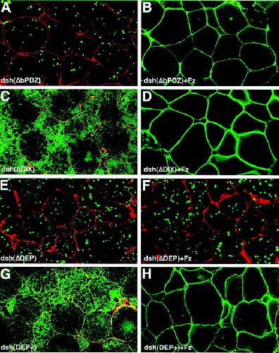 plasma membrane are also stained only by Dsh–GFP or Fz, demonstrating that the colocalization of Dsh–GFP and Fz is not absolute