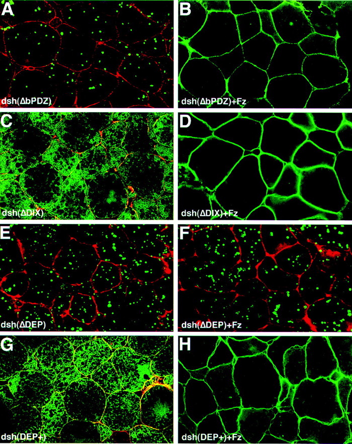 Analysis of Dsh domains required for Fz-dependent relocalization of Dsh in Xenopus animal cap cells. (A) Dsh(ΔbPDZ)–GFP localizes to the cytoplasm in a punctate pattern. (B) In response to Fz, Dsh(ΔbPDZ)–GFP relocalizes to the plasma membrane (shown) and is also present in filopodia (not shown). (C) Dsh(ΔDIX)–GFP does not display a punctate pattern and instead is distributed diffusely throughout the cytoplasm (but is excluded from yolk granules). (D) In response to Fz, Dsh(ΔDIX)–GFP relocalizes to the plasma membrane (shown) and is also present in filopodia (not shown). (E) Dsh(ΔDEP)–GFP localizes to the cytoplasm in a punctate pattern. (F) Dsh(ΔDEP)–GFP, however, does not relocalize to the plasma membrane in response to Fz and displays a punctate pattern similar to that seen in the absence of Fz. (G) Dsh(DEP+) is diffusely cytoplasmic in the absence of Fz, and is sufficient to promote membrane localization in the presence of Fz (H). Texas Red phalloidin was used to visualize cell outlines in A, C, E,and G.