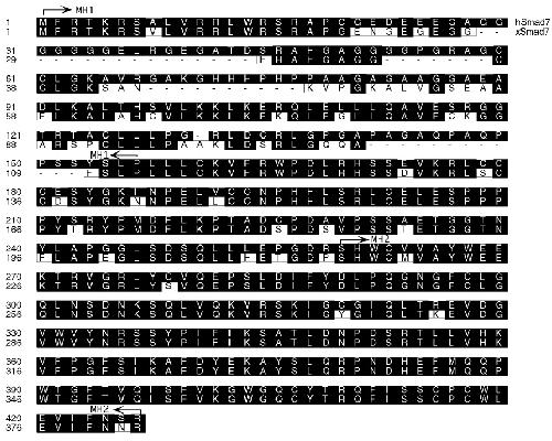 FIG. 1. Structure of Xenopus Smad7. Alignment of the predicted amino acid sequences of human Smad7 and Xenopus Smad7. Identical