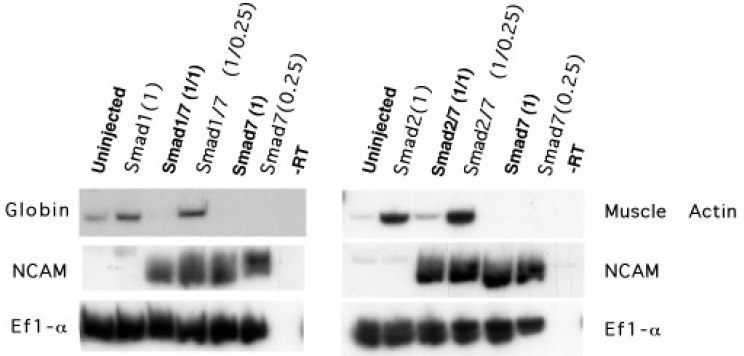 FIG. 6. (Top) Smad7 blocks activation of mesoderm markers in the embryo. Albino embryos were injected with 25 pg of Smad7 RNA in