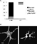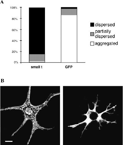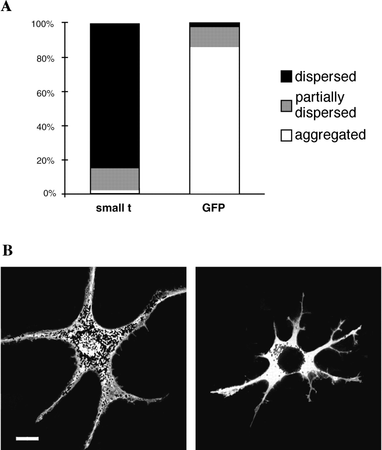 Figure 1. Inhibition of PP2A by the small t antigen blocks melanosome aggregation. (A) Melanophores transfected with plasmids encoding the small t antigen or GFP were treated with 10 nM melatonin for 90 min and fixed with formaldehyde. Cells expressing the small t antigen were identified by immunofluorescent staining with an antibody against the SV-40 small t antigen. The vertical axis shows the percentage of cells that were scored as aggregated (white), partially dispersed (grey), or dispersed (black). Scoring was done as described in Materials and Methods. Note the almost complete inhibition of pigment aggregation in the small t-expressing cells. The data are from over 400 small t-expressing and over 500 GFP-expressing cells from three separate experiments. (B) A cell expressing small t maintained its pigment in a dispersed state after melatonin treatment (left), whereas a GFP control cell aggregated pigment normally (right). The cells are shown by overlaying bright-field images onto fluorescent images. Bar, 20 μm.