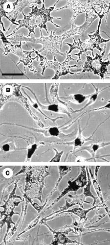 Figure 3. Phase-contrast images of nontransfected cells (A), and cells transfected with the PKA inhibitor plasmid (B), or with the plasmid encoding the inactive analogue of the inhibitor (C). After 72 h, a large percentage of cells in the culture expressing the active inhibitor had fully aggregated pigment. Control cells maintained their melanosomes in the dispersed state. Bar, 50 μm.