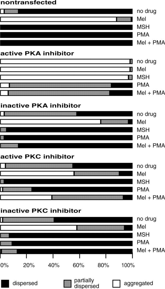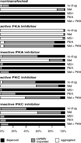 Figure 4. Quantitative analysis of the effects of the active and inactive PKA and PKC inhibitor peptides on melanosome aggregation and dispersion. Cells expressing the PKA inhibitor aggregated their pigment and could not disperse it when treated with MSH. These cells partially dispersed melanosomes in response to PMA. Cells expressing the inactive PKA inhibitor dispersed melanosomes normally in response to MSH and PMA. Cells expressing the PKC inhibitor dispersed pigment when treated with MSH, but were inhibited from dispersing pigment after aggregation with melatonin and treatment with PMA. Percentages are from scoring 200 cells per treatment. Similar results were obtained in at least three other independent experiments with each inhibitor.