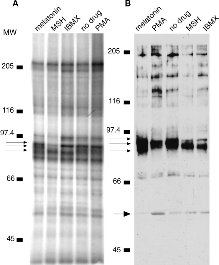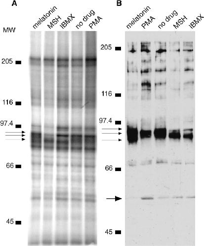 Figure 6. Phosphorylation of melanosome proteins in cells treated with 10 nM melatonin, 100 nM MSH, 0.1 μM PMA, or 1 mM IBMX. Phosphorylation differences were reproduced in three separate experiments. (A) Cells were labeled with 32Pi for 21 h before melanosome purification. The differences in phosphorylation are found in the 85–95 kD area. Melanosomal proteins from melatonin-treated cells show phosphorylation at ∼86, 92, and 95 kD (arrows), whereas proteins from MSH- and IBMX-treated cells are phosphorylated at 87 and 94 kD. Proteins from untreated and PMA-treated cells show phosphorylation in a broad band from 88–95 kD. (B) Western blot of melanosomal proteins with the anti-phosphothreonine antibody. The pattern of threonine phosphorylation looks very similar in the mol wt range 85–95 kD to the pattern of total phosphorylation in A. There is less phosphorylation on melanosomes purified from cells treated with IMBX and MSH than on melanosomes purified from cells treated with melatonin, whereas it appears that untreated and PMA-treated cells are in a phosphorylation state intermediate between that of aggregating and dispersing cells. In addition, phosphorylation of the band at 50 kD is reduced with melatonin treatment.