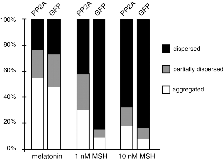 Figure 2. Overexpression of PP2A inhibits melanosome dispersion at low levels of cAMP. Cells transfected with plasmids encoding the HA-tagged PP2A catalytic subunit or GFP were treated with 25 μM dexamethasone for 24 h to induce PP2A expression. Cells were then treated with 10 nM melatonin for 1 h to aggregate pigment, followed by 1 nM or 10 nM MSH for 30 min. PP2A-expressing cells were identified by immunofluorescent staining with an antibody to HA, and 100 cells were scored per treatment. The data is from a typical experiment; similar results were obtained in three independent experiments.