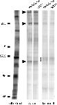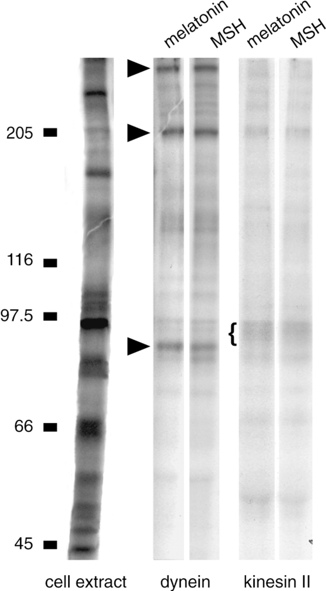 Figure 7. Immunoprecipitations of kinesin II and cytoplasmic dynein from 32Pi- labeled melanophore extract. Left lane, cell extract. Immunoprecipitates of dynein from melatonin-treated and MSH-treated cells show strong phosphorylation at the molecular weights of the dynein intermediate chain (83 kD) and the dynein heavy chain, and at an unidentified band at 200 kD (arrowheads). Immunoprecipitates of kinesin II from melatonin-treated and MSH-treated cells have phosphorylation in a broad band at 95 kD (bracket). No consistent phosphorylation differences have been observed in immunoprecipitations of dynein or kinesin II.