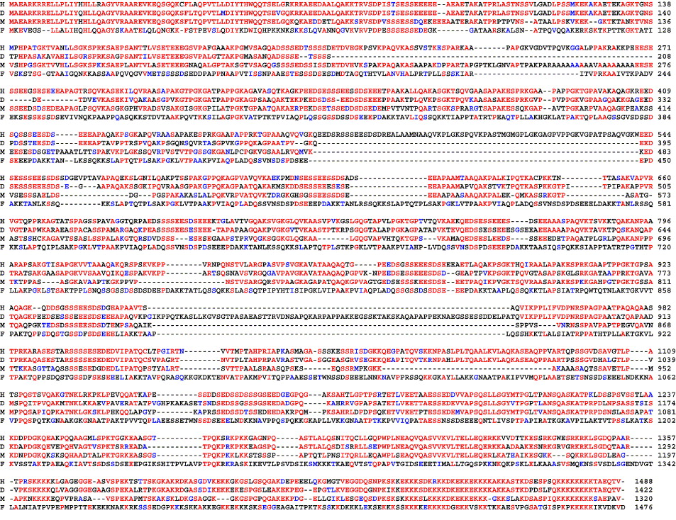 Alignment of the cDNA-derived amino acid sequences from human (H, GenBank accession no. NM_000356), dog (D, GenBank accession no. NM_001003057), mouse (M, GenBank accession no. NM_011552), and frog (F, GenBank accession no. AY731504) using ClustalW and BOXSHADE programs. Red letters show identical amino acids, blue letters indicate similarity and black letters show absence of homology. The dashed line shows absence of corresponding sequence.