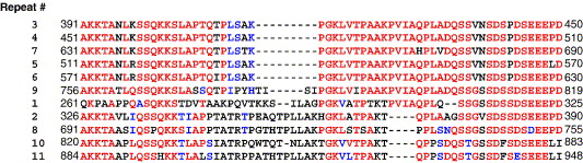 Alignment of the 11 repeats in the cDNA-derived amino acid sequence of Xenopus laevis treacle. Color codes are similar to those described in Fig. 1. The repeats are arranged in decreasing homology.
