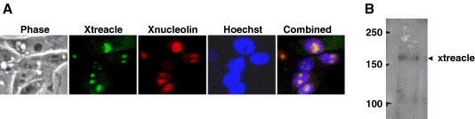 Characterization of X. laevis treacle (xtreacle). (A) Indirect immunofluoresence staining shows nucleolar localization of the antigen which co-localizes with nucleolin/C23 (xnucleolin) in X. laevis kidney A6 cells. (B) Western blot analysis of A6 cell nuclear extract using 1 : 10,000 anti-xtreacle antibody recognizes a â¼160 kDa antigen.