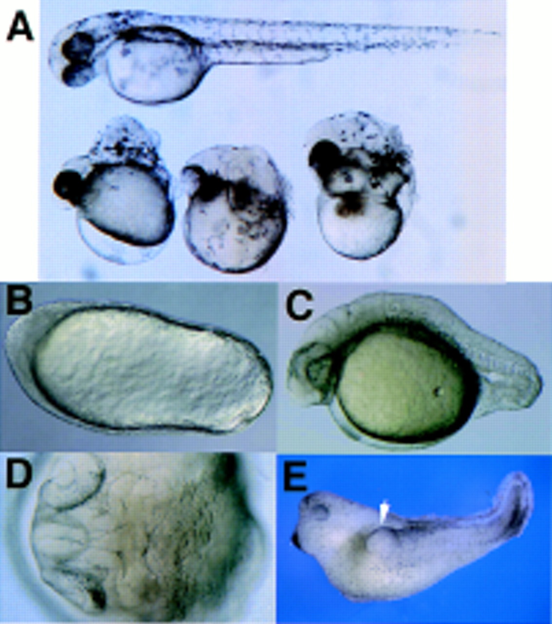 âPhenotypes of dharma mRNA-injected embryos. (A) dharma mRNA (5 pg)-injected embryos at 48 pfh. (Top) Normal embryo at 48 pfh. (Bottom)dharma mRNA-injected embryos with the Snh-like phenotype. (BâD) dharma RNA (12.5 pg)-injected embryos. (B) An embryo with football shape at 12 pfh. (C) An embryotail malformation at 24 pfh. (D) An embryo Snh-like phenotype at 24 pfh (dorsal view). (E) The double-axis phenotype in the Xenopus embryo induced by dharmaexpression. One-hundred picograms of dharma mRNA was injected into the ventralâvegetal cell with 40 pg of β-galactosidase mRNA. (White arrow head) Second axis. Out of 24 injected embryos, 9 embryos were normal, 11 contained double axes, 2 were dorsalized, and 2 had spina bifida. Of the 11 double-axis embryos, 9 exhibited X-gal staining only in the endoderm, and 2 exhibited X-gal staining in both the endoderm and the second axis. Control embryos injected with 100 pg of β-gal RNA were normal (data not shown).