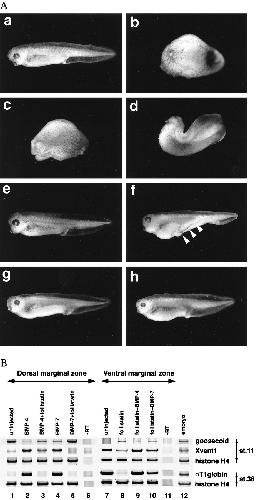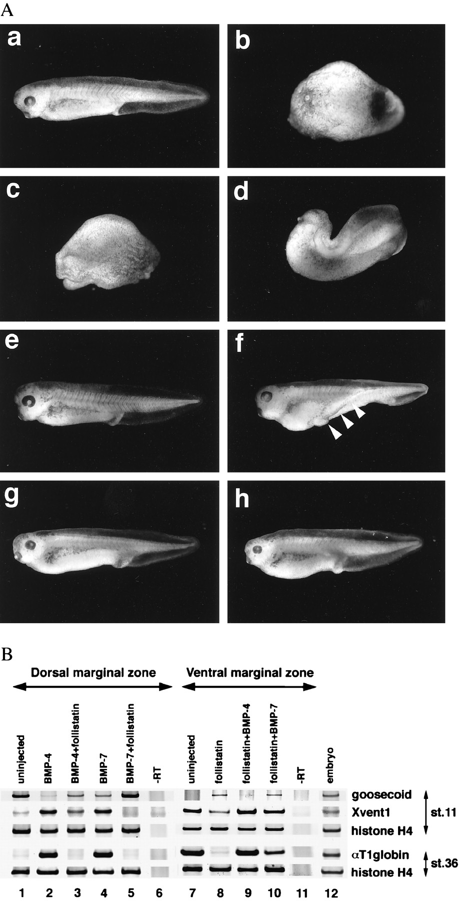 Inhibitory interaction between follistatin and BMPs. (A) Phenotypes of Xenopus embryos dorsally coinjected with BMP mRNA and follistatin mRNA. BMP-4 mRNA (200 pg), either alone (b) or with 100 pg of follistatin mRNA (d), and BMP-7 mRNA (500 pg), either alone (c) or with 50 pg of follistatin mRNA (e), were injected into the equatorial region of the two dorsal blastomeres at the four-cell stage as described (28). In contrast, equatorial regions of two ventral blastomeres at the four-cell stage were injected with follistatin mRNA (60 pg), either alone (f), with 500 pg of BMP-4 mRNA (g), or with 2 ng of BMP-7 mRNA (h). Embryos were evaluated and photos were taken at the tadpole stage. (a) Uninjected embryo. (B) Expression of molecular markers in dorsal and ventral marginal explants. Embryos were either uninjected (lane 1, 6, 7, 11, and 12) or injected with the mRNAs indicated on the top of each lane into the equatorial region of two dorsal (lane 2â5) or ventral blastomeres (lane 8â10) at the four-cell stage. The amounts of mRNA for dorsal injection were 200 pg of BMP-4 (lane 2), 200 pg of BMP-4 plus 200 pg of follistatin (lane 3), 500 pg of BMP-7 (lane 4), and 500 pg of BMP-7 plus 50 pg of follistatin (lane 5). For ventral injection, 60 pg of follistatin mRNA, 500 pg of BMP-4 mRNA, and 2 ng of BMP-7 mRNA were used. Lane 12 shows the expression of markers in whole embryos and lane 6 and 11 show the control reactions with no RT step. Dorsal or ventral marginal zones were excised and explanted at the early gastrula stage and incubated until sibling embryos reached stages 11 and 36.