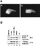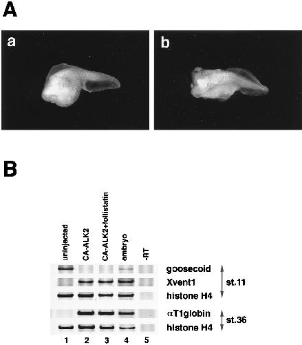 Failure of follistatin to block intracellular BMP signaling. (A) Phenotype of ventralized embryos by the dorsal injection of mRNA for constitutively active BMP-signaling receptor, with or without follistatin mRNA. Fifty picograms of mRNA for a constitutively activated form of Xenopus ActRI (CA-ALK2) was injected dorsally with (b) or without (a) 200 pg of follistatin mRNA as described in the legend for Fig. 1. (B) Expression of molecular markers in dorsal marginal explants of embryos that were uninjected (lane 1), injected with 500 pg of mRNA for CA-ALK2 alone (lane 2), and coinjected with 500 pg of CA-ALK2 and 200 pg of follistatin (lane 3). Dorsal mRNA injection and RT-PCR analysis were performed as described in Fig. 1. Coinjection of follistatin mRNA did not reduce the effect of CA-ALK2 overexpression for both dorsal (goosecoid) and ventral (Xvent1, αT1 globin) markers. Similar results were obtained in the experiments using CA-ALK3 (data not shown).