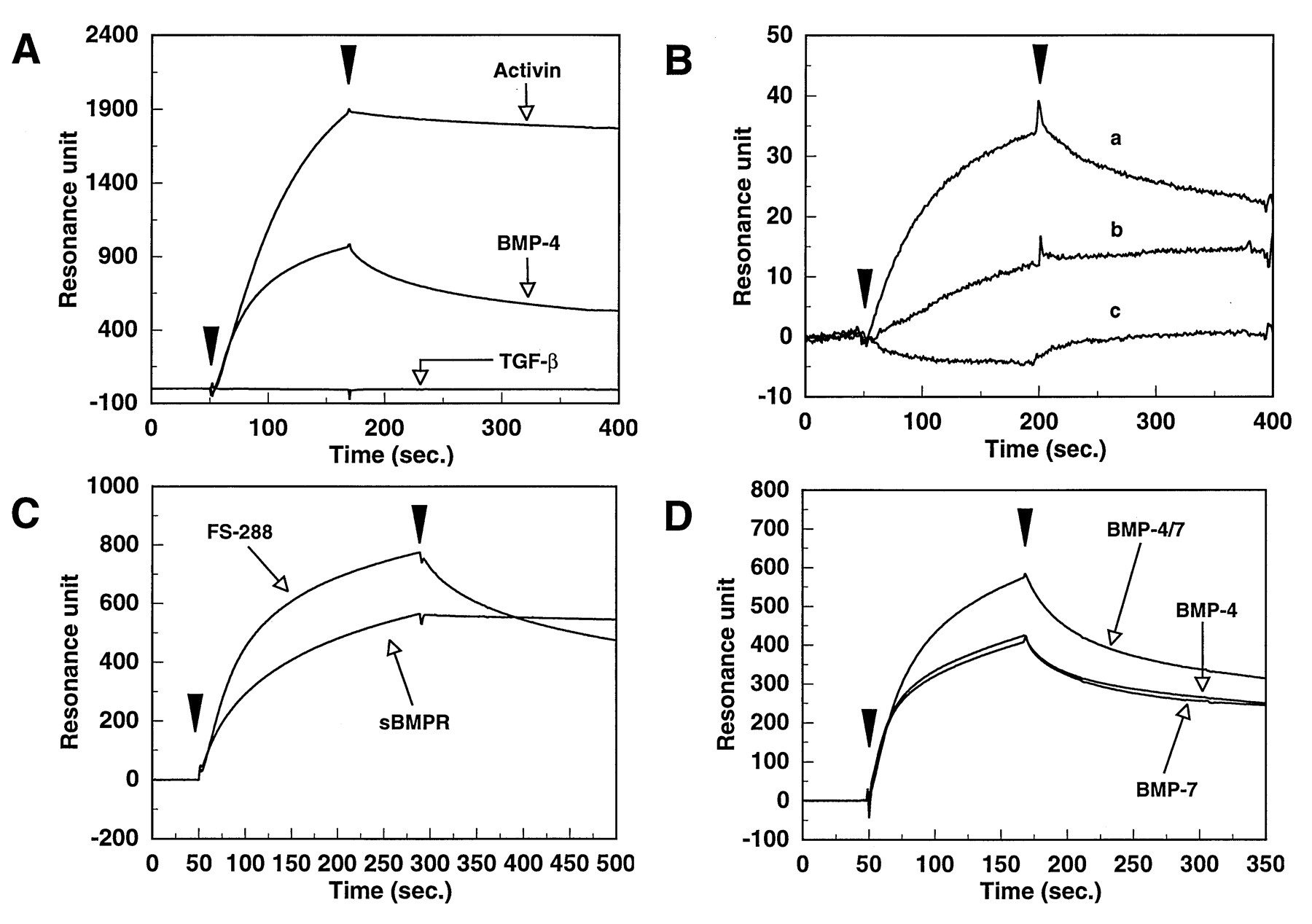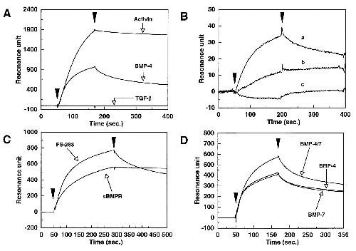 Direct binding of follistatin to immobilized BMPs. (A) BMP-4, activin A, and TGF-β1 were immobilized on the sensor chip surface. The immobilization levels of BMP-4, activin A, and TGF-β1 were 2904, 2543, and 2681 resonance units, respectively. FS-288, at a concentration of 5 μg/ml, was injected over these surfaces. (B) FS-288 (807 resonance units) was immobilized on the sensor chip surface. (a) BMP-4 (1 μg/ml) was injected over the surface. (b) BMP-4 (1 μg/ml) and FS-288 (0.5 μg/ml) were incubated for 30 min at room temperature. The mixture was injected over the surface. (c) Mixture of BMP-4 (1 μg/ml) with FS-288 (2.5 μg/ml) was incubated and injected as described above. Excess soluble FS-288 almost completely abolished the binding activity on the FS-288 surface. (C) FS-288 and sBMPR, at the concentration of 5 μg/ml and 20 μg/ml, respectively, were injected over the surface of immobilized BMP-4, separately. (D) BMP-4, BMP-4/7, and BMP-7 were immobilized on the sensor chip surface. The immobilization levels of these ligands were 622, 768, and 697 resonance units, respectively. FS-288 at 5 μg/ml was injected over these surfaces.