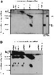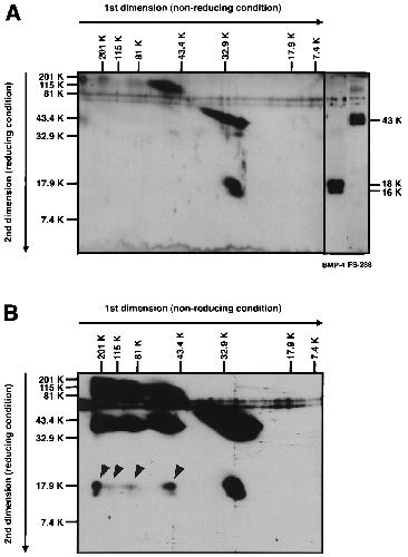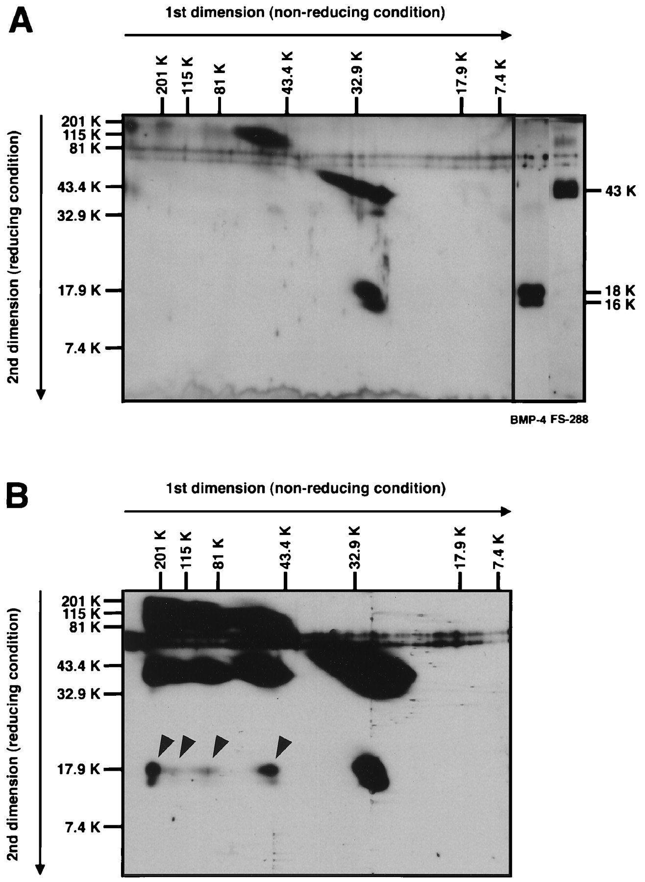 Diagonal SDS/PAGE analysis of FS-288-BMP-4 complex. (A) For comparison of molecular mass, a mixture of FS-288 and BMP-4 was analyzed by 2D electrophoresis. Although FS-288 (32 kDa) tends to shift to higher molecular mass region (>60 kDa) on first dimension electrophoresis probably by self aggregation, a major band of BMP-4 shows the estimated molecular mass of dimeric form (30 kDa). FS-288 was detected as a 43-kDa protein, and BMP-4 was detected as 16- and 18-kDa proteins, which were generated because of difference of glycosylation, under reducing condition. (B) Cross-linked FS-288-BMP-4 complex was analyzed. Proteins were separated by 2D electrophoresis and subjected to Western blotting. At least, four-shifted bands (arrowheads) of BMP-4, which were not seen in A, were detected. Relative molecular mass is indicated horizontally for nonreducing, vertically for reducing condition.