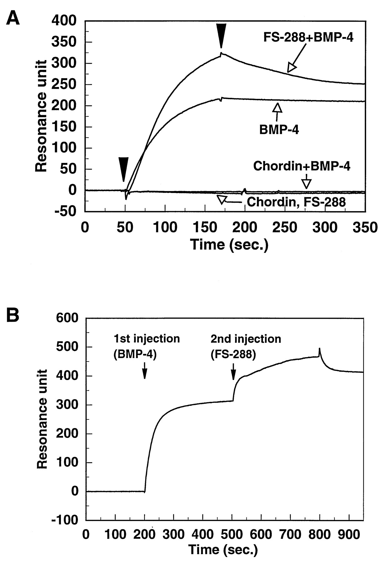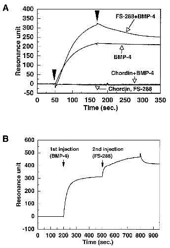 Different competitive mechanisms of two BMP-4 antagonists. (A) BMP-4, chordin, and FS-288, at the concentration of 10 μg/ml, 2 μg/ml, 20 μg/ml, respectively, were injected over the surface immobilized sBMPR, separately. For the competition assay, a mixture of BMP-4 with chordin or FS-288 was injected. (B) FS-288 was injected after the injection of BMP-4 over the sBMPR-immobilized surface by using of the coinjection method. The concentrations of BMP-4 and FS-288 were 10 μg/ml and 5 μg/ml, respectively. Both proteins were injected at a flow rate of 10 μl/min for 300 s.