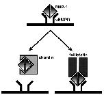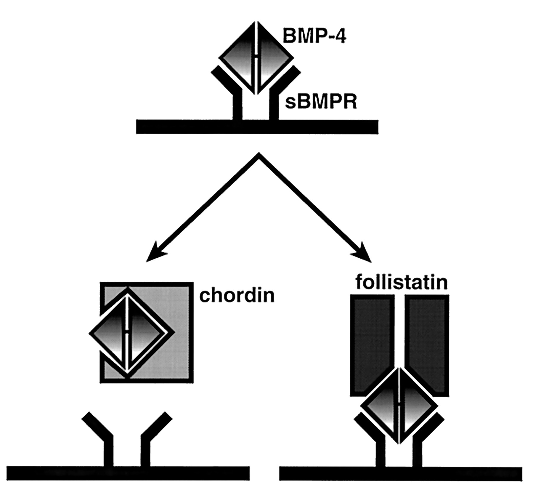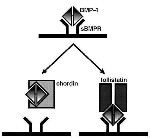 Possible inhibitory mechanisms of the BMP action by follistatin and chordin. Chordin inhibits the binding of BMP-4 to its type I receptor (sBMPR). On the other hand, follistatin can bind to sBMPR through BMP-4, forming a trimeric complex.