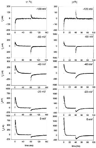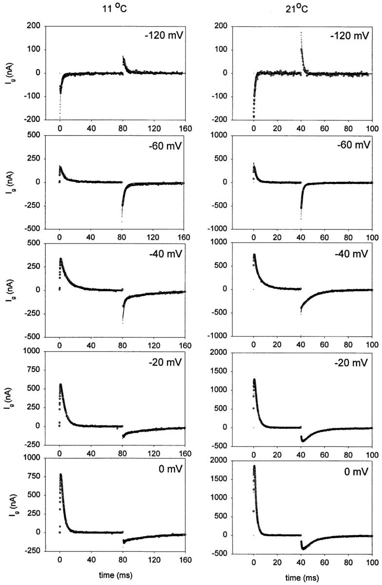 Figure 16. Data and model prediction. Family of gating current traces (○) obtained at two different temperatures (21 and 11°C) fitted with an 11-state sequential model (dots) with parameters shown in Table III. Unsubtracted gating currents elicited in response to variable test pulses from −120 to 0 mV. Holding potential was −90 mV. The test pulses were 40- and 80-ms long at 21 and 11°C, respectively. Data obtained at 21°C was filtered at 5 kHz and digitized every 50 μs. Data obtained at 11°C was filtered at 2.5 kHz and digitized every 80 μs.