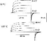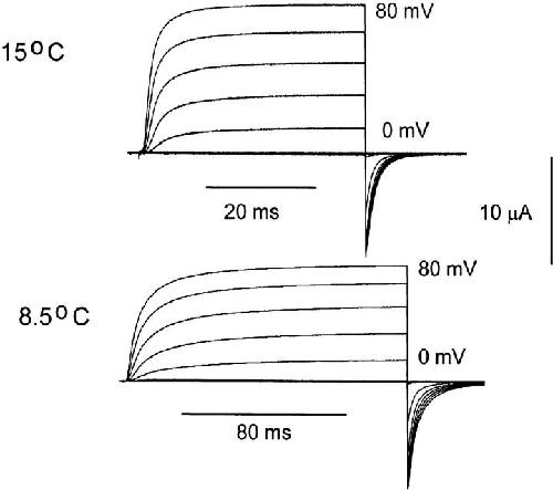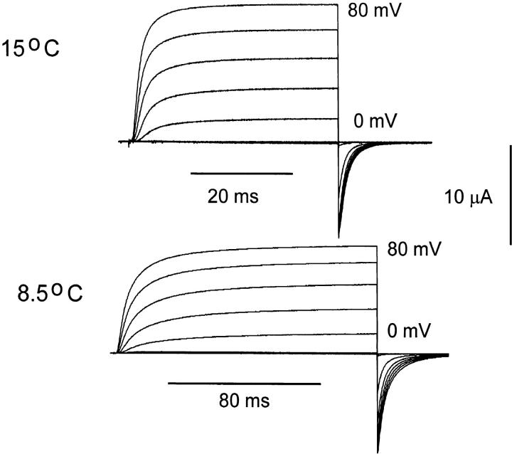 Figure 1. Macroscopic ionic currents from ShH4ir at 15.1°C and 8.5°C. Currents were elicited in response to test pulses from −80 to +80 mV in 10-mV increments from and returning to a holding potential of −90 mV. The test-pulse duration was 40 ms at 15.1°C and 180 ms at 8.5°C. Data obtained at 15.1°C was filtered at 5 kHz and digitized every 50 μs. Data obtained at 8.5°C was filtered at 1 kHz and digitized every 180 μs. Internal solution 120 K+-MES and external solution 60 K+-MES. A P/−4 subtraction protocol was used.