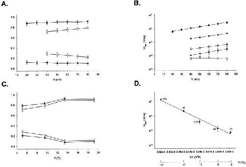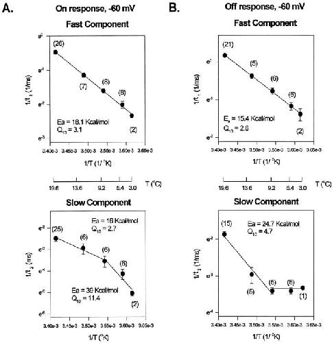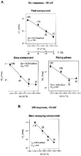 Figure 10. Arrhenius plots of the decaying kinetic components of the gating currents elicited as a response to a test pulse of −60 mV. The On and the Off responses of the experimental traces were fitted with a three- exponential function: a rising phase followed by two decaying components. (A) Arrhenius plots for the On response decaying kinetic components at −60 mV. (B) Arrhenius plot for the Off response decaying components. Energy of activation, Ea, obtained from the slope of the Arrhenius plot (slope = −Ea/R).