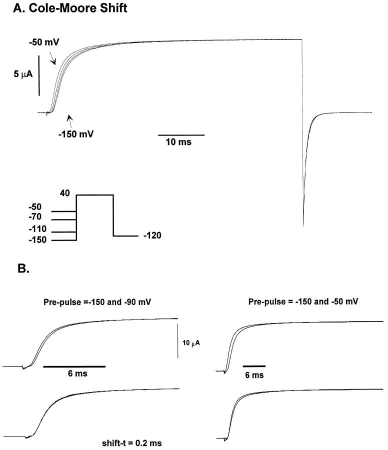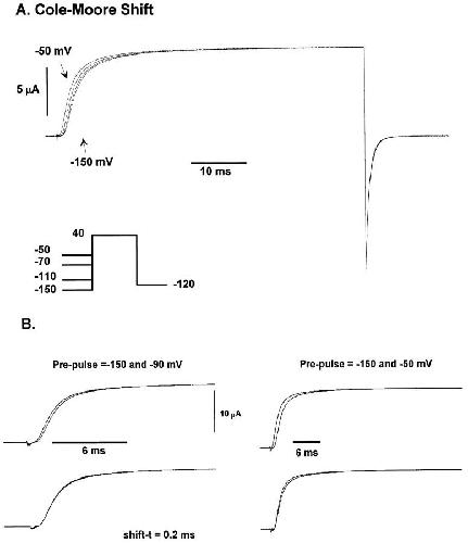 Figure 3. Kinetics of early transitions of the activation pathway using the Cole-Moore protocol. (A) Family of macroscopic ionic currents from ShH4ir obtained at 15.1°C elicited in response to variable hyperpolarized prepulses (between −150 and −50 mV), followed by a 40-mV test pulse and a postpulse of −120 mV (Cole-Moore protocol). The holding potential was −90 mV. A P/−4 subtraction protocol was used. Data was filtered at 5 kHz and digitized every 60 μs. Internal solution: 120 K+-MES, and external solution, 60 K+-MES. (B) Superposition of the ionic current traces obtained with the Cole-Moore protocol at 18.7°C. Holding potential was −90 mV. P/−4 subtraction protocol was used. Data was filtered at 5 kHz and digitized every 50 μs. Internal solution 120 K+-MES and external solution 60 K+-MES. Shown are the ionic current superposition after shifting in time (shift-t), using as a reference the current obtained with a −150 mV prepulse. Notice the excellent superposition between the traces obtained with prepulses of −90 and −150 mV, and the poor superposition of the −50 and −150 mV pre-pulses.