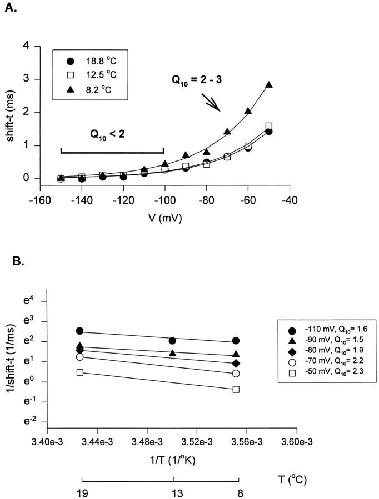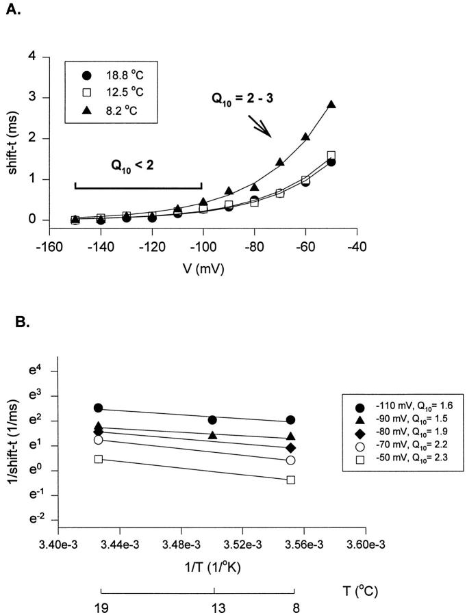 Figure 4. Temperature dependence of the Cole-Moore shift (shift-t). (A) Delay or time shift (shift-t, in milliseconds) due to the hyperpolarized prepulses at different temperatures. Lines show fit to a single exponential function of the voltage dependence of the Cole-Moore shift at each temperature tested. (B) Arrhenius plot of the Cole-Moore shift. 1/shift-t as a function of temperature at different voltages of prepulses.