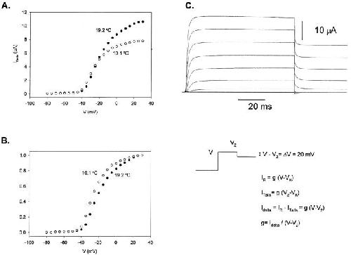 Figure 5. Conductance (G) versus voltage (V) curve. (A) G-V curves obtained at two different temperatures, 19.2 (•) and 10.05 (○) °C. (B) Normalized delta family G-V curves for the same data shown in A. Notice the shift to the left when the temperature decreases, (∼−5 mV), corresponding to an entropic change (TΔS at 20°C) of ∼−7 kcal/mol. (C) Macroscopic ionic currents elicited with the Delta-V protocol at 19.2°C. Data obtained was filtered at 7.5 kHz and digitized every 30 μs. Test pulses (V) from −80 to 30 mV in 10-mV increments, keeping constant the difference with respect to the postpulse potential (V2) (V − V2 = 20 mV). Holding potential = −90 mV. VK, reversal potential; IR, current measured at the end of the test pulse; Itails, current measured at the onset of the postpulse; G, macroscopic conductance = nγ(V)Po, where n is the number of channels, γ(V) is the unitary conductance, and Po is open probability. Internal solution 120 K+-MES and external solution 20 K+-MES. The P/−4 subtraction protocol was used.